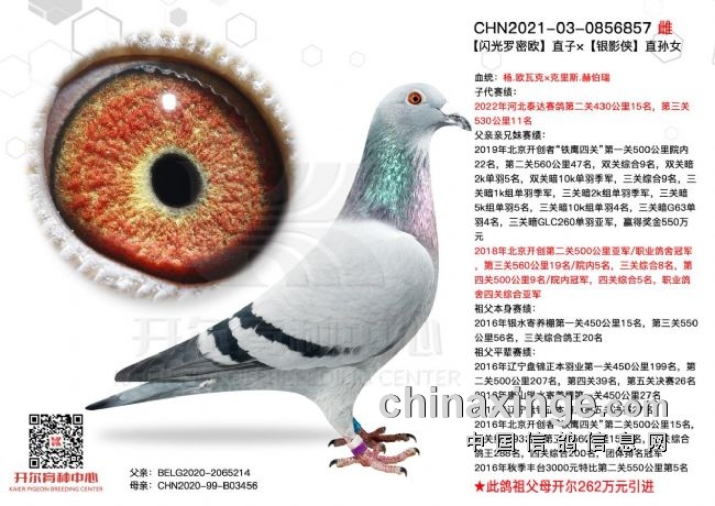 2016年开尔以主打血系杨欧瓦克征战国内赛场,银影侠作为代表,斩获银水寄养棚第一关15名、第三关56名、三关综合鸽王20名!之后它在种鸽舍的发挥更是令人叹为观止,18年开始,它的后代获北京开创第四关院内冠军、四关综合5名、职业鸽舍四关综合亚军,北京开创第一关院内22名、双关综合9名、三关综合9名,武汉金岛56名,唐山阳光寄养棚49名,天津宇翔决赛25名、精英赛冠军,河北泰达双关冠军,持续发挥到第5代,连续六年发挥,让银影侠成为开尔种鸽舍闪耀的功臣鸽!