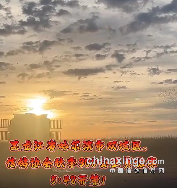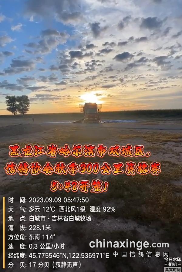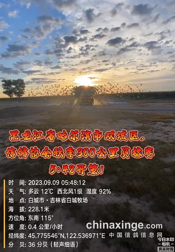 哈尔滨市双城区信鸽协会300公里资格赛,于9月9日早上5点48分开笼,司放地白城子,共计3477羽赛鸽参赛,天气晴,西北风一级。