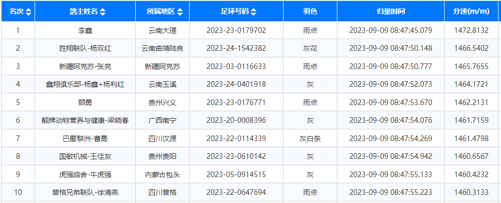 不到二十分钟,公棚上空见鸽归巢。李鑫的一羽雨点鸽2023-23-0179702暂时领先,分速1472.8132米/分;胜翔联队-杨双红的2023-24-1542382灰花分速1466.5402米/分,暂排第二;新疆阿克苏-张亮的雨点鸽2023-03-0116633暂列第三,分速1465.7655米/分。截至9点40分,已有5943羽赛鸽归巢报到。