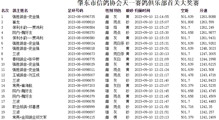 强胜鸽舍-史金强的一羽黄眼灰雌率先完成打钟,这羽环号0096735的小将凭借1263.8088米/分的成绩摘得桂冠,飞行空距501.639公里。拿下冠军已十分不易,但这位鸽友的“本事”不止如此,他的另外四羽赛鸽同样表现优异,分别拿下6、7、10、11名,飞行分速均超1243米/分,一人前十独占四席,实力确实强劲!