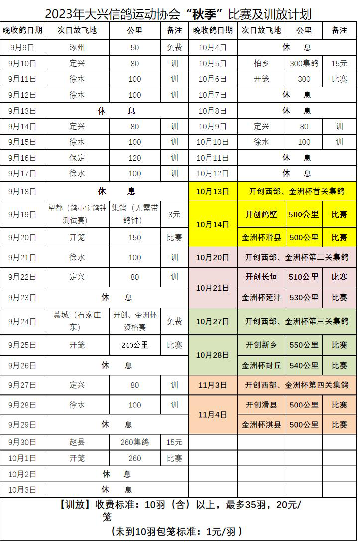 9月11日,北京市大兴区信鸽协会发布最新版训赛计划,9月9日开启首次免费训放,四训一休(每训四天休息一天),至9月20日开启第一场150公里秋赛。