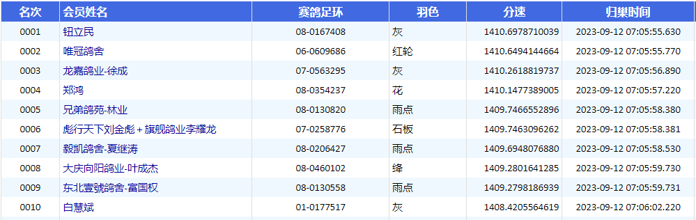一个小时后,大批赛鸽归巢报到。钮立民的08-0167408灰鸽飞出1410.6978米/分,排名第一;唯冠鸽舍的06-0609686红轮分速1410.6494米/分,暂列第二,其与第一名的成绩极其逼近。第三名是龙嘉鸽业-徐成的07-0563295灰鸽,成绩是1410.2618米/分。