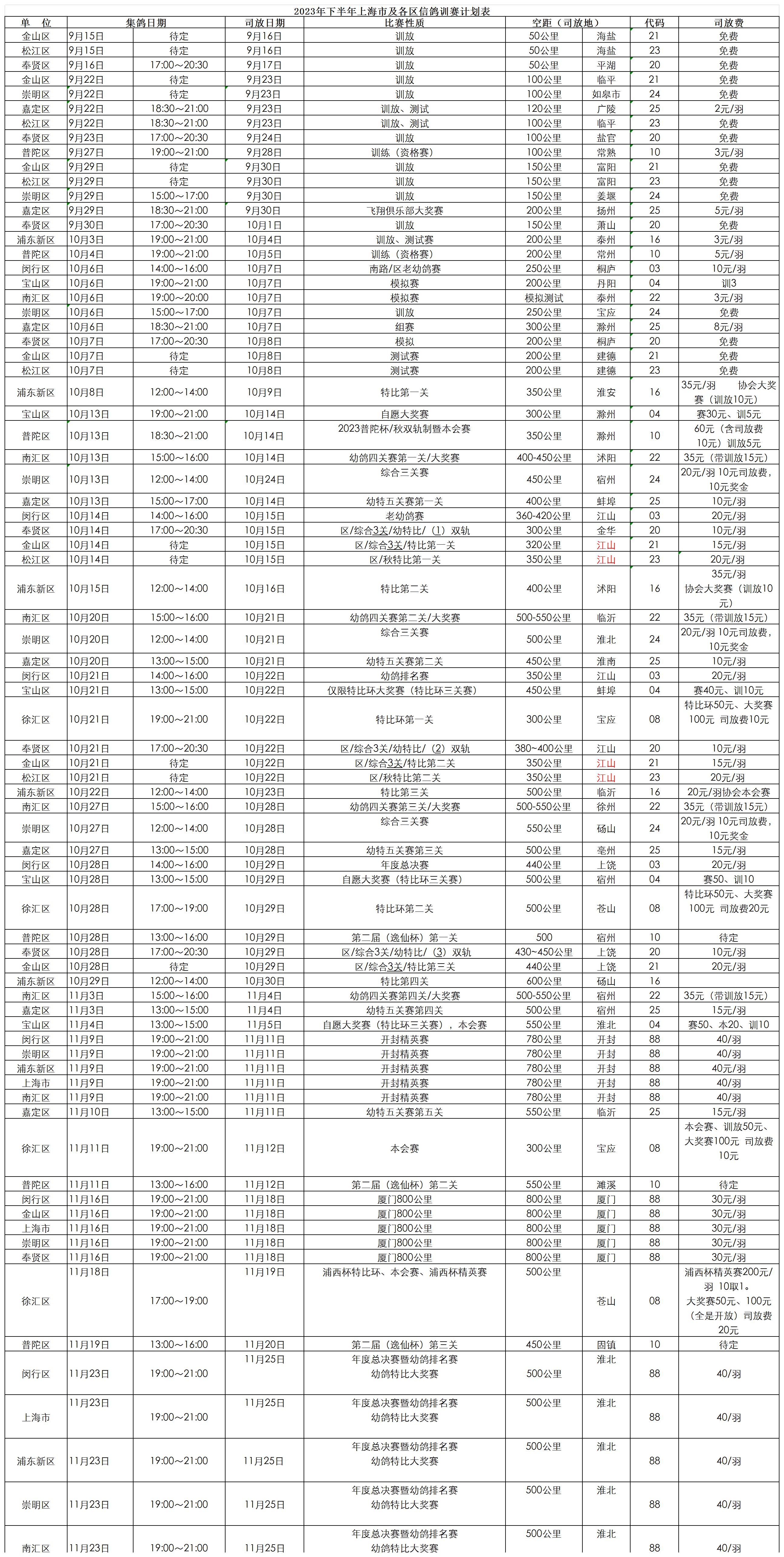 进入9月,秋赛的脚步加快,作为中国信鸽运动的发源地,上海也加入秋赛的比拼队伍。近日,上海市信鸽协会公布了2023年下半年上海市及各区信鸽训赛计划表,计划表显示,从9月15日起,上海各区将陆续开启秋赛的训放工作,其中上海金山、松江将于9月16日进行首次训放,司放费0元。