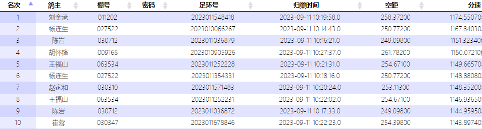 10:14:43,首羽赛鸽归巢报到,是杨连生的2023010066267,分速为1167.8403米/分,由于空距最终拿下本场比赛的亚军,其麾下另一羽2023011354331拿下本场第六名,前50名占十席,综合实力不容小觑。