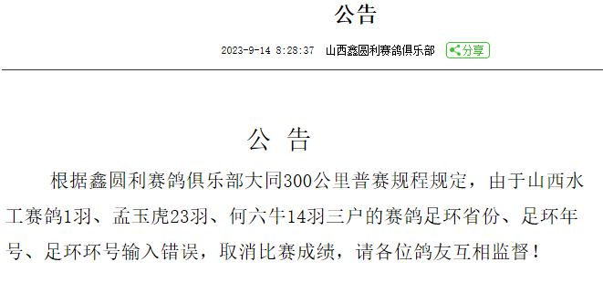 9月14日,俱乐部发布公告,称根据赛事规程,三名鸽友名下的累计38羽赛鸽,由于赛鸽足环省份、年号、环号等信息输入错误,取消比赛成绩。而在俱乐部此前发布的参赛规程中,确实有明确标注“凡输错足环省份、足环年号、足环环号的赛鸽一律取消该鸽成绩”。