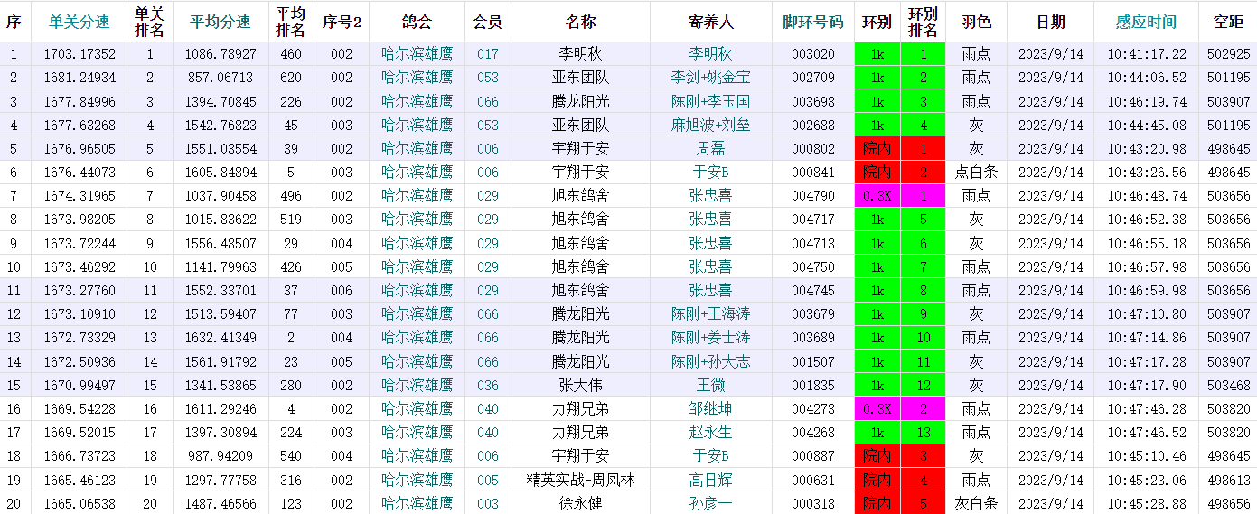 院内冠亚季军都来自宇翔于安团队,其中周磊000802的赛鸽拿下院内冠军,总排名第5位,分速1676.96505米/分;于安B环号000841的赛鸽拿下院内亚军,总排名第6位,分速1676.44073米/分,另一羽环号000887的赛鸽拿下季军,总排名第18位,分速1666.73723米/分。