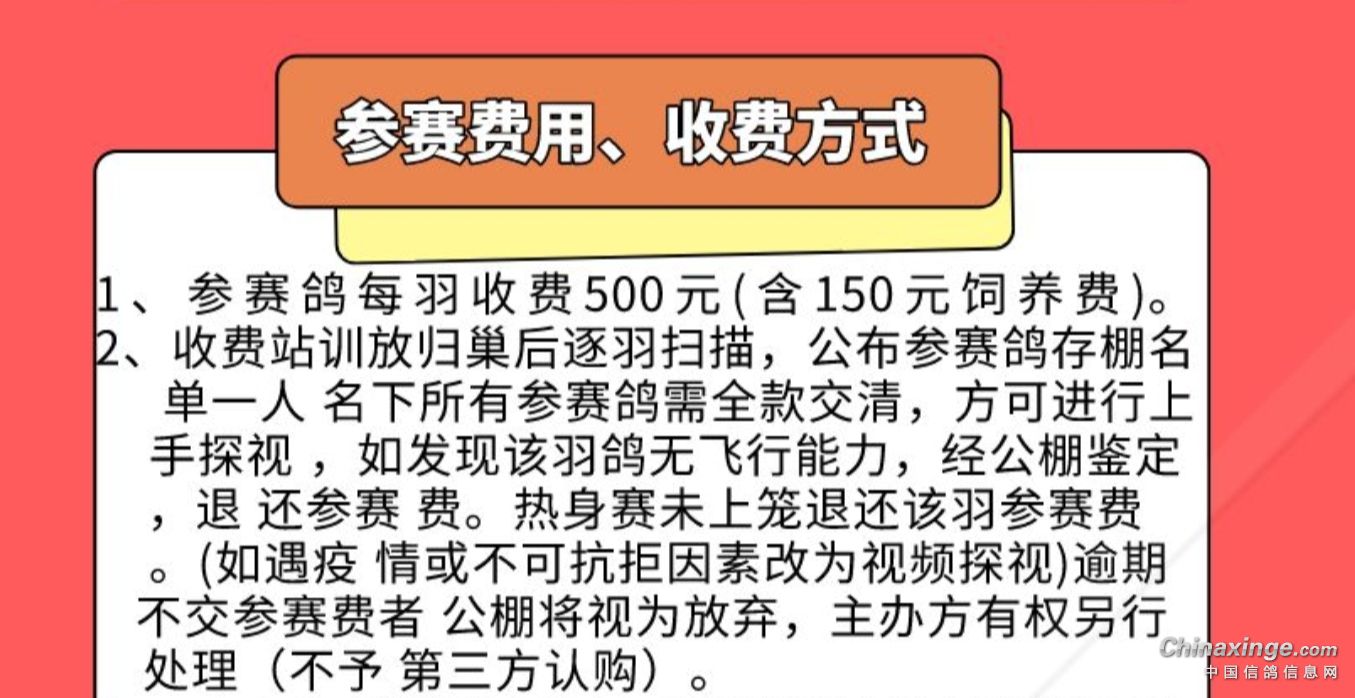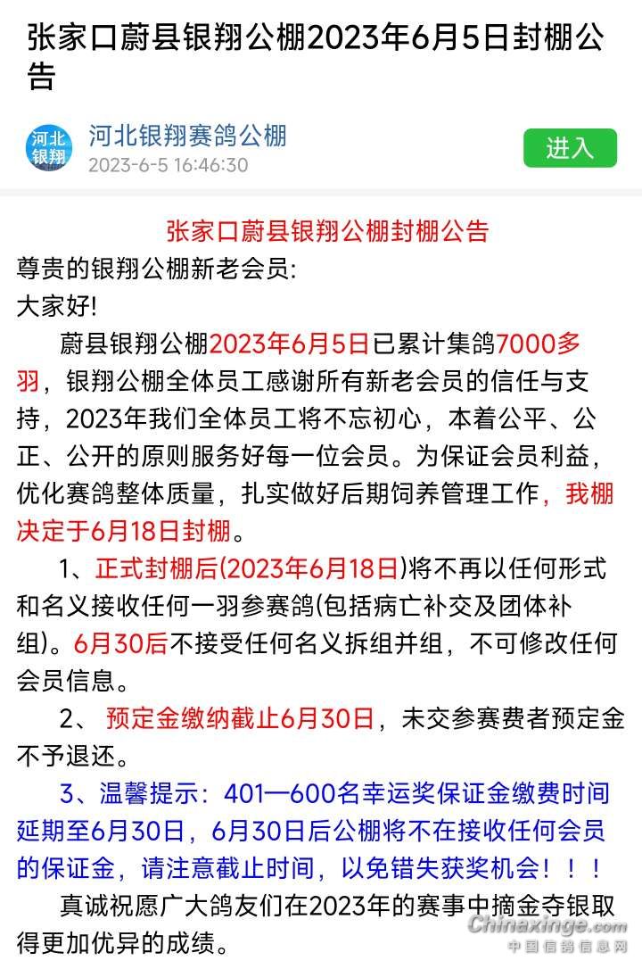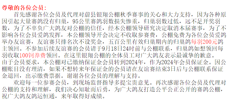 9月16日,河北蔚县银翔公棚发布公告,95公里收费站赛归巢羽数过低,决定取消2023年秋赛,举办友谊赛,只排名次不设奖金,五百公里有效归巢期内的归巢鸽每羽200元鸽主领回。不参加后续友谊赛的归巢鸽如想领回每羽收取100饲养费领回。已缴纳保证金会员转到2024年,如不想转来年保证金的保证金退回。