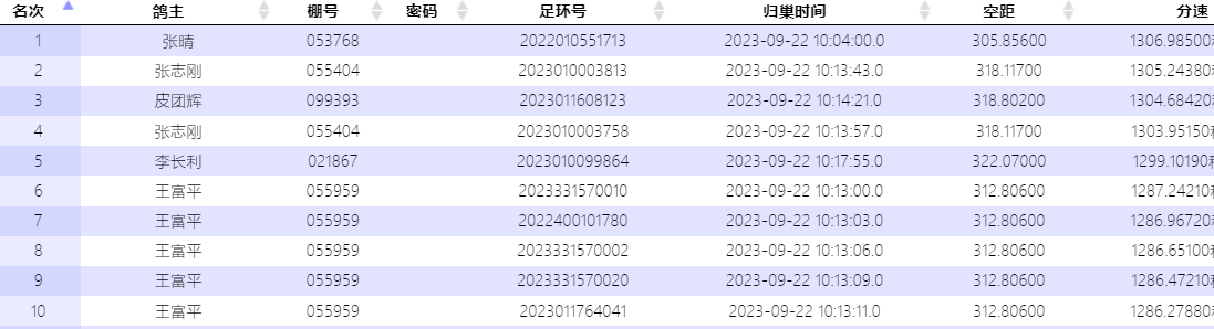 此外,鸽友王富平一人拿下6名、7名、8名、9名、10名的好成绩,17羽赛鸽冲进前百名,综合实力杠杠的。截至9月23日9点30分,共计586羽赛鸽归巢。