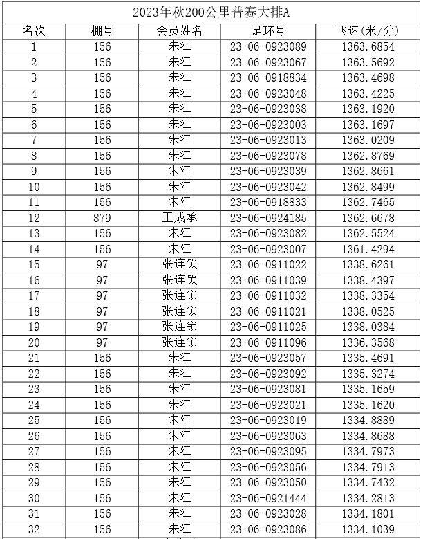 上午8点29分,朱江鸽友展现了强劲的整体实力,飞出梦幻联队:不仅在6分钟内报进41羽赛鸽,均入围前100名,还包揽前11名、13、14、21-32名等高位名次,成为第一场比赛的焦点。