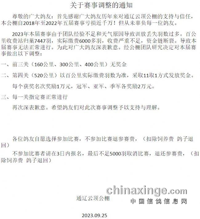 公棚指出,2018-2022年五届赛事公棚累计亏损近千万元。2023年,由于团队经验不足、天气原因导致训放丢失羽数过多,收费站实际缴费严重不足(缴费6000多羽),资金链断裂,为此调整赛事:前三关无奖金;第四关按百公里实际缴费羽数为准,采取11取1方式发放奖金。每个获奖名次奖励1万元,冠军、亚军、季军各奖励2万元;每一关指定赛正常进行;不参与比赛的扣除饲养费鸽子退回。