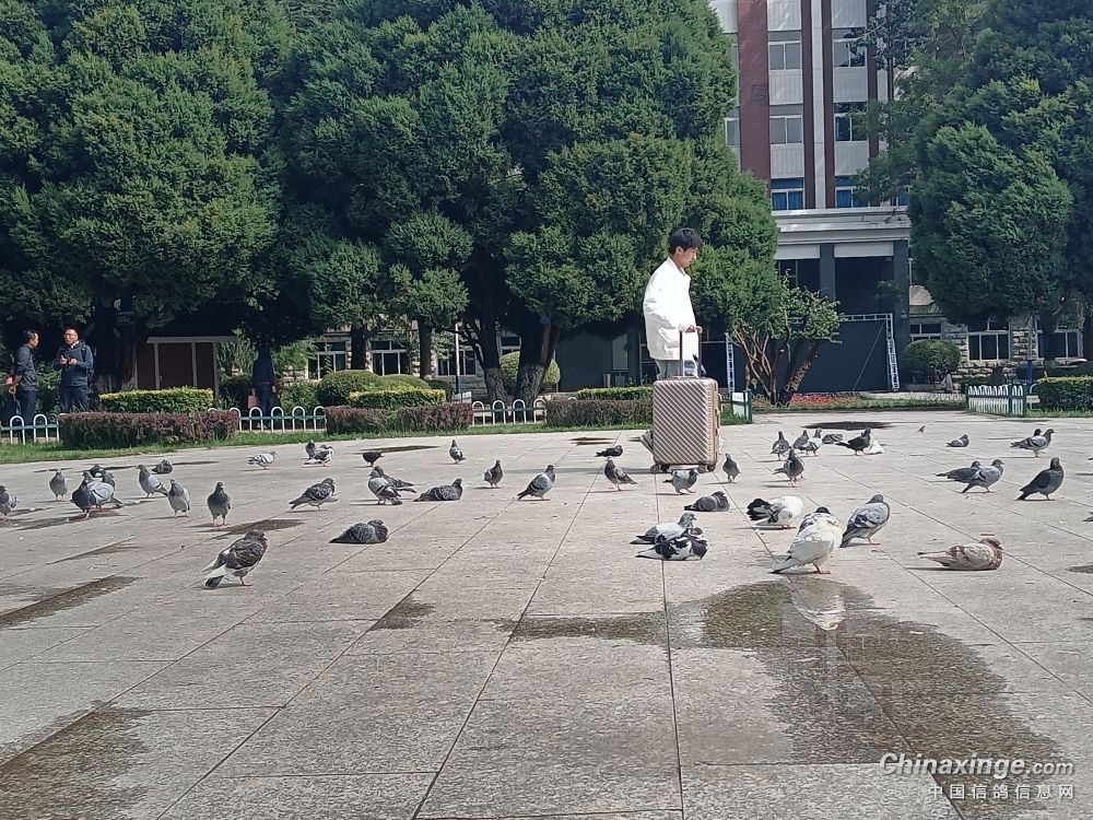出行的学子推着皮箱从鸽群中走过,并没有影响到它们的休憩,多少年的互相陪伴,让这群鸽子和学校成为了一个整体,鸽子成了学校的一个亮点,而学校也给了它们一个自由而有快乐的殿堂。