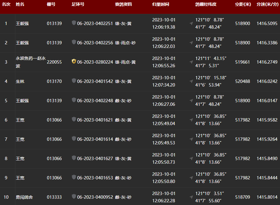 中午12点05分,王宽连归四羽赛鸽,飞行空距517.982公里,分速1415米/分,排名6-9名。12点06分,王毅强有三羽赛鸽报到,飞行空距518.9公里,后来居上,拿下冠军、亚军和五名,冠军分速1416.5095米/分。