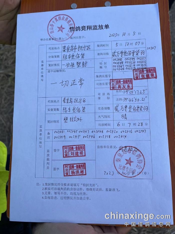 10月6日,经过几个月的多番轮训拉练,唐山春兴公棚迈入100公里收费站,20307羽在秦皇岛南戴河开笼放飞。7点28分放出,8点44分15秒第一羽踩板进棚,分速定格,胜负已定,紧随其后的归巢大军鱼贯而入。截至当日17时许,归返率约85%,赛鸽仍在陆续归巢中(以上数据以公棚公告为准)。