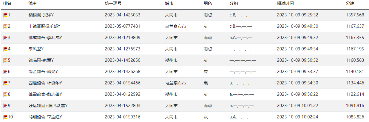 此次200公里热身赛,于早上06:58:13开笼,4826羽赛鸽上笼。09:25:32,首羽赛鸽归巢,是来自山西大同市的鸽友栖梧阁-张洋的一羽2023-04-1425053雨点鸽,分速1357.568米/分。约24分钟之后,第二批次的多羽赛鸽归巢,其中第二羽归巢鸽在09:49:30报进,分速1167.637米/分。截至下午15点整,累计报进2519羽赛鸽。