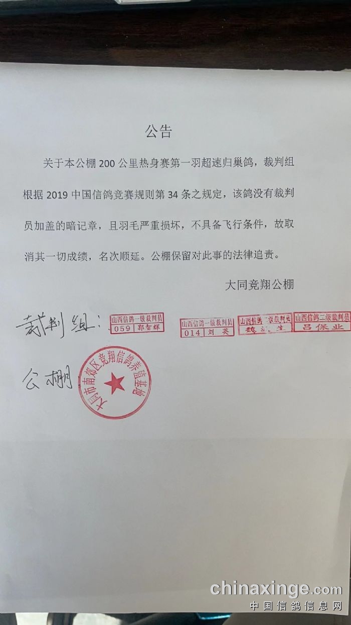 9日下午,公棚发布重要公告指出,首羽超速归巢鸽,没有裁判员加盖的暗章,且羽毛损坏严重,不具备飞行条件,因此取消该名鸽友的一切成绩,名次顺延。同时,公棚保留对此事的法律追责。