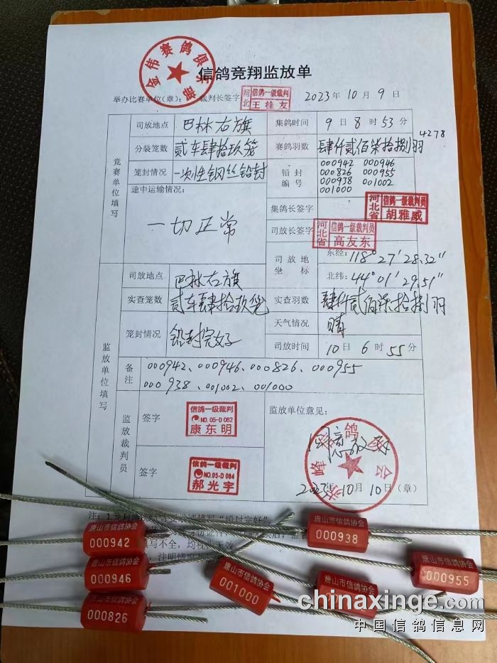 10月10日,唐山金伟赛鸽俱乐部2023年秋季特比环第一关比赛,于早上6:55开笼,司放地巴林右旗,天气晴,有西南风,参考空距498.165公里,共计4278羽赛鸽参赛。
