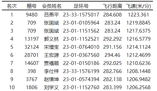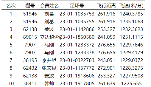 上午10:00,南区率先见鸽归来,会员立达鸽舍(刘文进)的23-01-1850580赛鸽,飞行空距241.059公里,分速为1231.1113米/分,最终排名南区第四名。10:16、10:17,刘葛的23-01-1035753、23-01-1035755两羽先后报到,分别获得总排名及南区冠军、亚军,飞行空距261.916公里,冠军分速为1240.3785米/分。姜波的23-01-1142886于10:10:33报到,获得南区季军,飞行空距253.327公里,分速为1232.3623米/分。