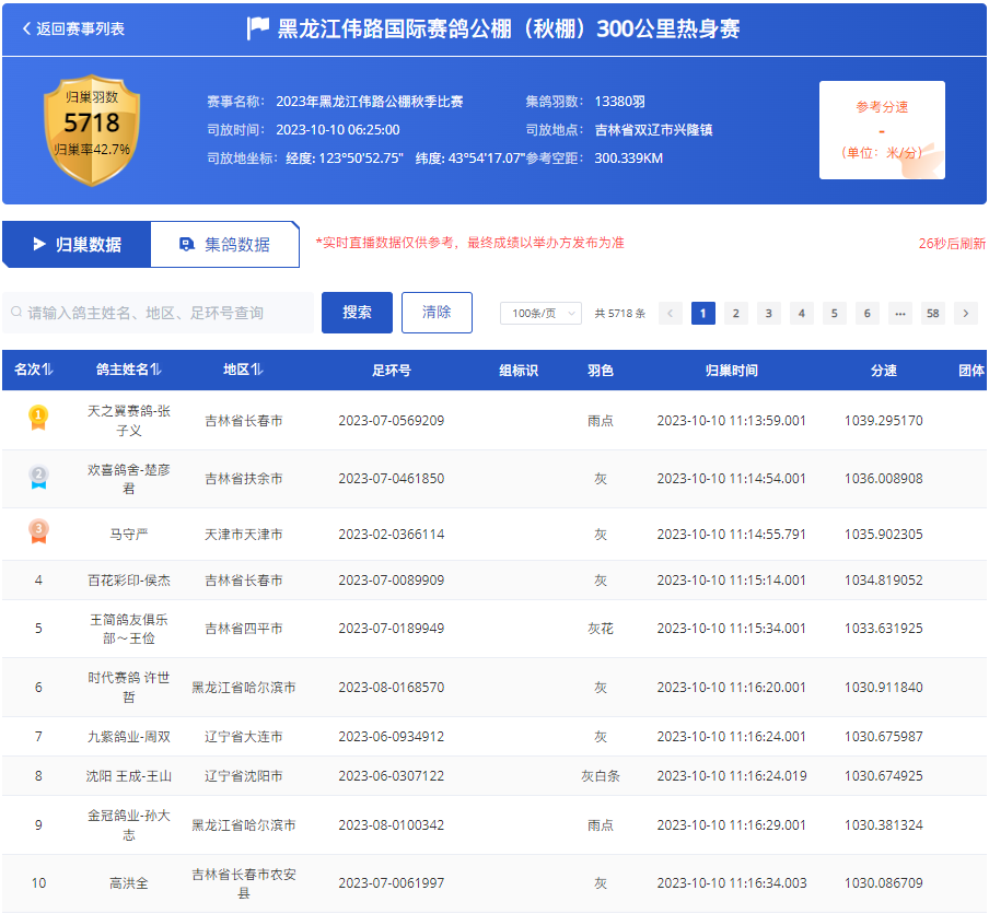 10月10日早上6点25分,黑龙江伟路国际赛鸽秋棚300公里热身赛打响,共计13380羽参赛鸽,放飞地林省双辽市兴隆镇。成绩直播>>