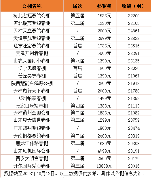 虽然21家春棚收鸽均超过2万羽,但从参赛费而言,低中高档均有。其中开尔国际爱心春棚收费最高,达到13888元,收鸽20016羽;其次则是天津开创者春棚、山东风帆国际公棚,分别收费5000元、4999元。2000元档的代表则是天津天立赛鸽春棚、天津宇航赛鸽春棚、天津彪行天下春棚、云南天南铜都赛鸽春棚、陕西慧能金鸽源公棚、陕西西安大明宫春棚等几家为代表。而超过一半(12家)的春棚收费还是比较亲民,在1000-2000元之间。