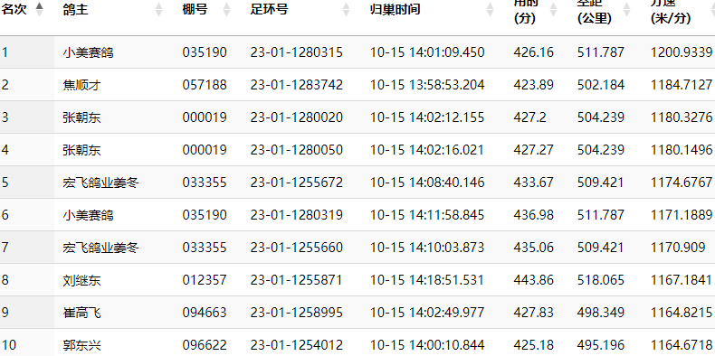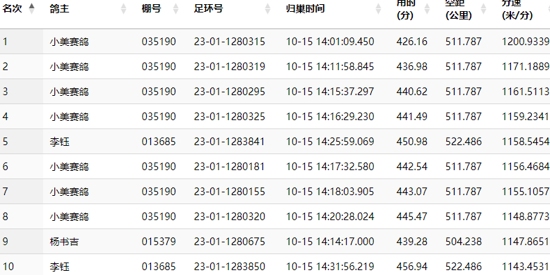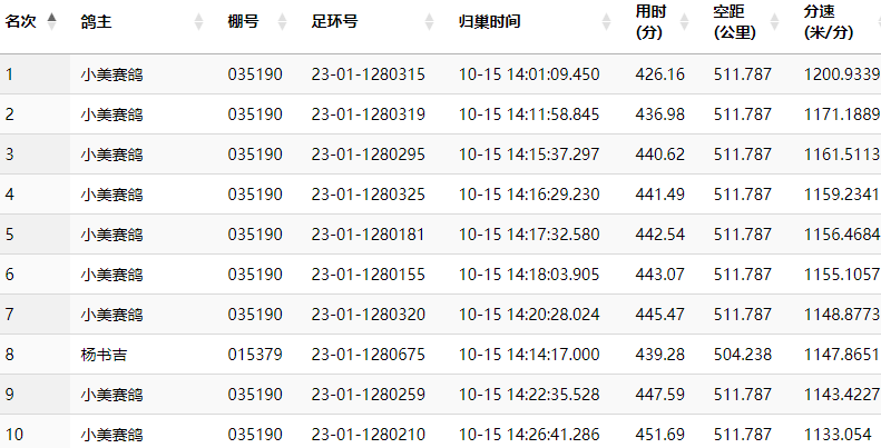 小美赛鸽在这场比赛中飞出了完美的战绩,他的23-01-1280315赛鸽,于14:01:09归巢报到,飞行空距511.787公里,分速为1200.9339米/分,拿下100、200、300三组特比冠军。