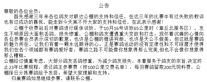10月19日,山东一家公棚发布一则公告,称公棚于收费站后对赛鸽进行缓体训放,由于65公里训放大面积丢鸽,原因不明,损失惨重,公棚和鸽友遭遇重大变故和打击。经慎重考虑,为减少鸽友损失,公棚决定终止23年比赛规程,退还鸽主参赛费(按100公里交费名单),每羽赛鸽留取200元饲料费,公棚择日分拣赛鸽给予发回。