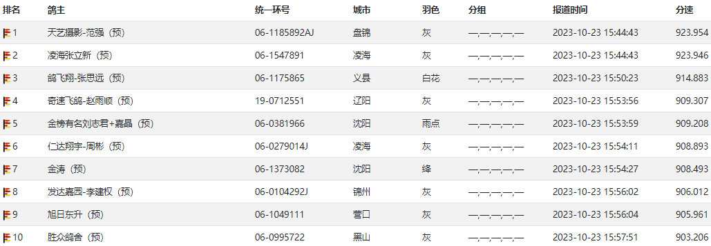 果然这是一场艰难的比赛,万羽赛鸽逆风战斗,狭路相逢勇者胜。下午15:44两羽赛鸽同时归巢,盘锦本地鸽友天艺摄影-范强的06-1185892灰鸽,率先进棚位列冠军,飞行的分速仅923.954米/分。凌海张立新的06-1547891灰鸽,飞行分速为923.946米/分,稍微落后屈居亚军。