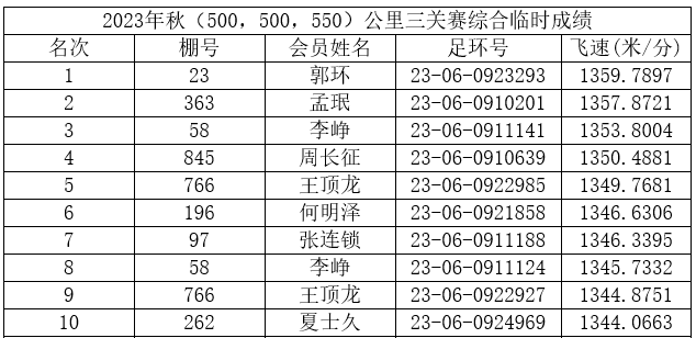 大连市信鸽协会2023年秋季60元特比环500、500、550公里三关鸽王赛落下帷幕,经过三场中距离比赛之后,郭环的23-06-0923293黄眼灰雄、孟珉的23-06-0910201、李峥的23-06-0911141分别获得鸽王冠军、亚军、季军。