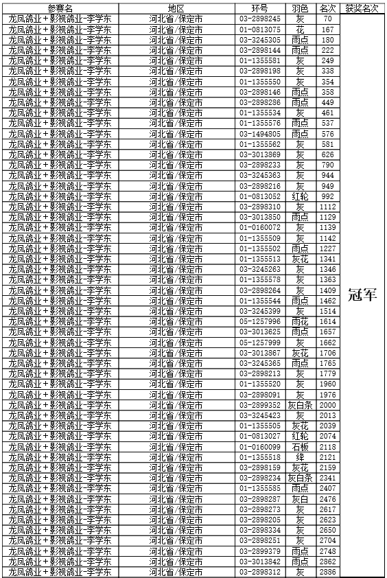成正矿业-任爱国上笼125羽,当日归巢112羽,规定名次之内入围29羽,排名季军。