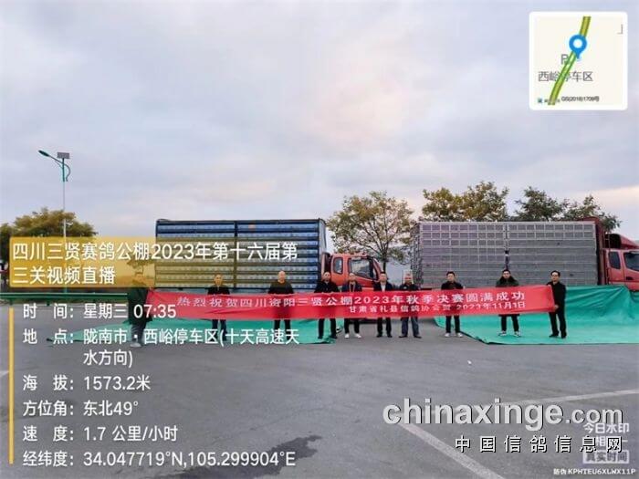 11月1日,四川省资阳市三贤公棚第十六届450公里决赛,于早上8点08分在甘肃西峪停车区开笼放飞,天气晴,比赛空距450.178公里。比赛共计放飞5727羽赛鸽,录取1000名。