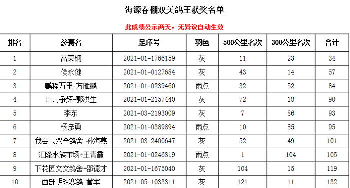 印象特别深的就是19年的春季北京市国家赛前50名,飞进去5个。21年春季海源公棚交费一羽,上笼一羽,飞的双关鸽王冠军,桑杰士配桑杰士。我为什么交它呢,这只鸽子的平辈,已经飞过一个双关鸽王冠军,是我给外地的鸽友出的一个特比环,双关的鸽王冠军,一关的9名,二关的3名。