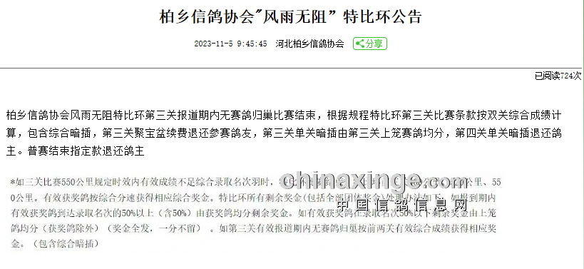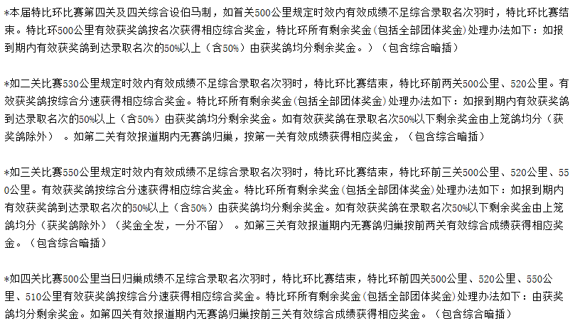 根据比赛规程,协会本届“风雨无阻”特比环大赛,设500+530+550+510公里四关,鸽友免费参赛。点击查看完整规程>>