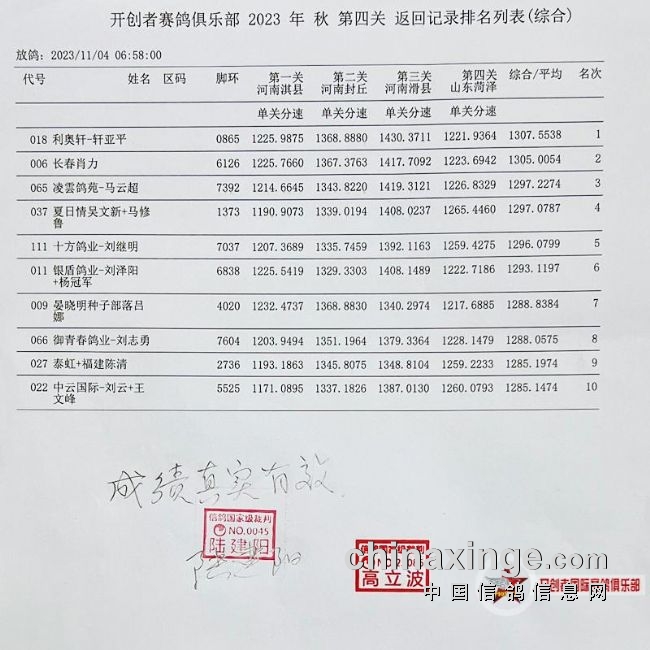 以下是2023年开创者四关综合前10名成绩及验鸽照片: