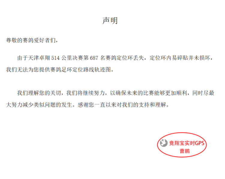 天津卓翔514公里决赛第687名赛鸽飞行途中GPS定位足环丢失,无法查询飞行轨迹图,但内部易碎贴及印章完好,经裁定成绩有效。