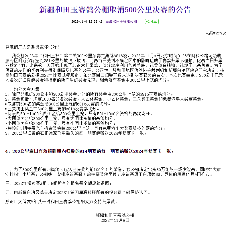 比赛次日(7日)继续报到,公棚发现有非正常归巢赛鸽,部分鸽友利用各种手段,违背体育精神,违规了比赛规程。公棚与裁判组研究决定,按照规程规定,比赛当日归巢羽数未达到决赛获奖鸽名次,本次比赛结束。300公里已获奖赛鸽的奖金兑现,剩余所有奖金由300公里上笼鸽均分。