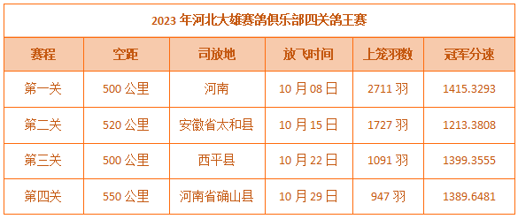 与去年相比,大雄特比由三关改为四关,虽然难度增加了,但人气却提升了一个级别,比赛售环5820枚,验鸽有格5008羽。第一关500公里比赛,广华通的2023-03-1481267从2711羽赛鸽中脱颖而出,以1415.3293米/分赢得冠军。此后鸽友们稳扎稳打,四关有效归巢800多羽,结束全部赛程。缔造苑-董松特的2023-03-1484030、王超杰+玖0的2023-03-1482858、孙二敬的2023-03-1481274分别获得后三关比赛冠军。