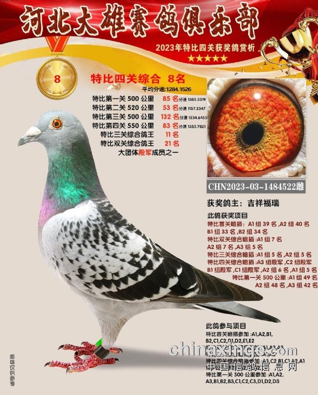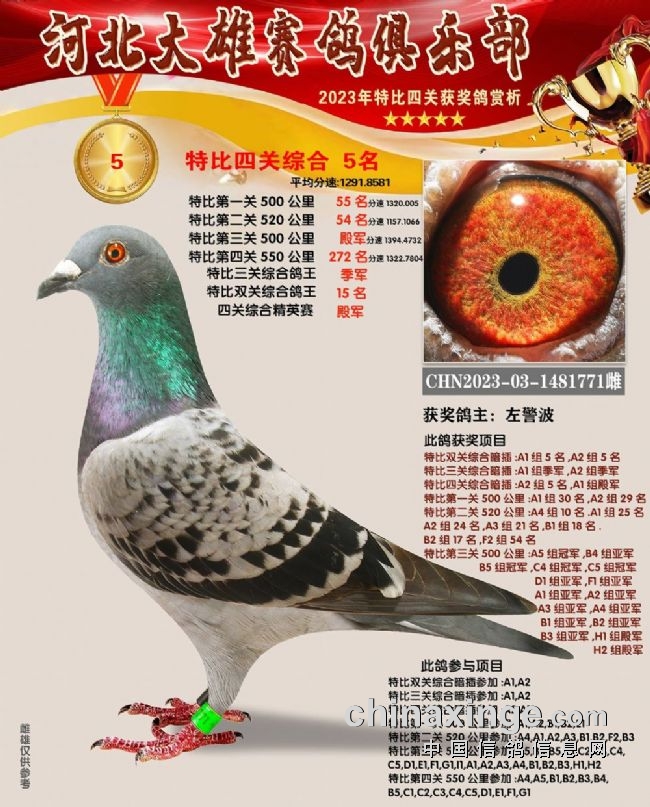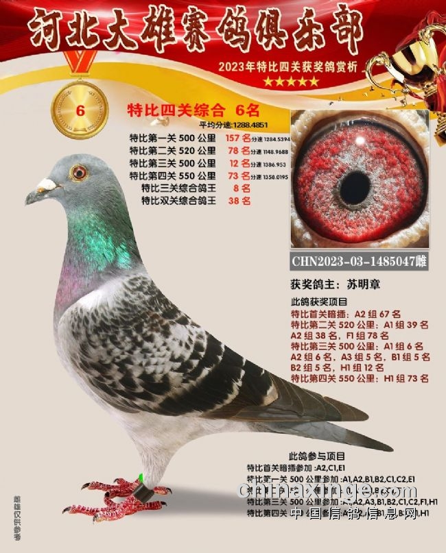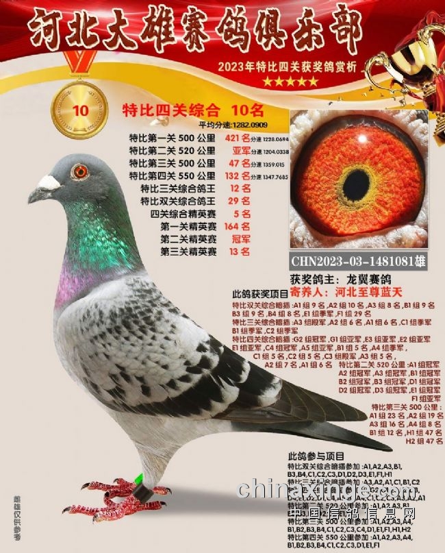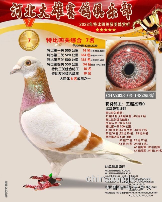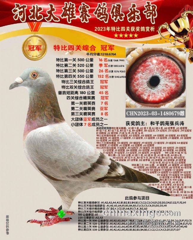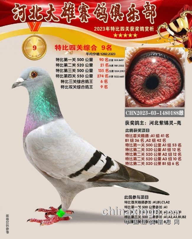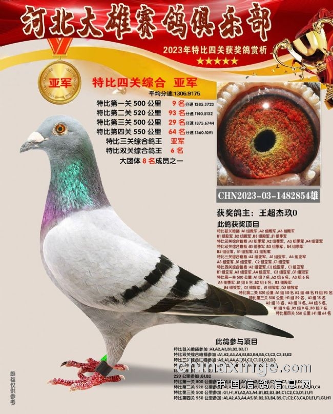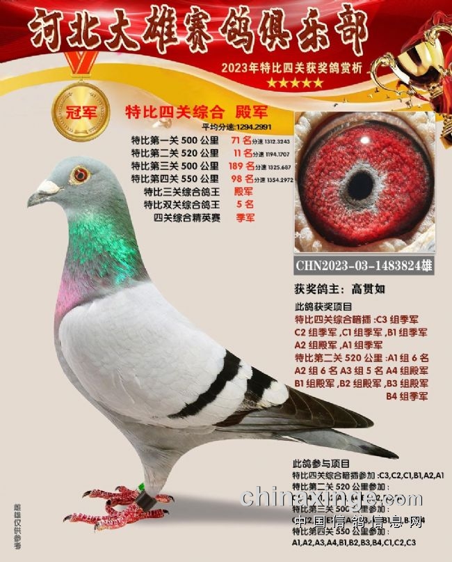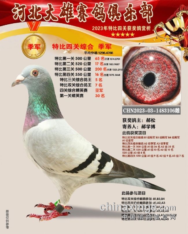 和平鸽苑张兵涛的2023-03-1480679雌鸽在180公里速度赛上就崭露头角,此后过关斩将,获得16名、季军、26名、152名,关关赢大奖,一举拿下双关鸽王、三关鸽王、四关鸽王、精英赛鸽王总冠军,堪称“四冠王”神鸟。王超杰玖0的1482854、1482853两羽连号鸽,一灰一红轮,四关稳定发挥,分别获得四关鸽王亚军、四关鸽王七名。郝松的2023-03-1483106灰雌既稳定又快速,获得65名、17名、200名、16名,获得四关鸽王季军。
