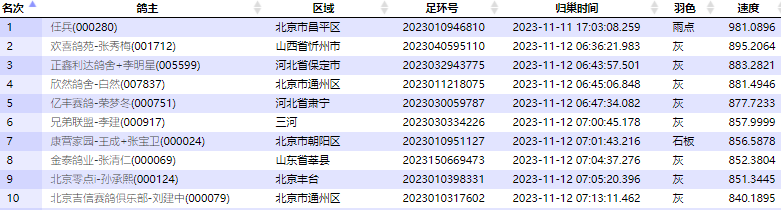 此后赛鸽陆续报到,截至下午17点,已有900多羽赛鸽归来。前十名报到数据如下: