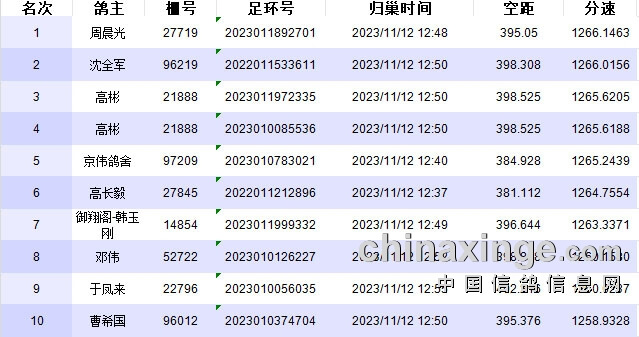 此后赛鸽陆续归来报到,当天报进9000多羽,比赛十分顺利。以下是前10名成绩: