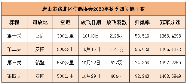 狠打四关,绝杀关归巢超九成,淬炼四百多羽精兵战鸽!唐山市路北区信鸽协会自10月8日390公里开打,经历500公里、550公里再到500公里的磨练,最终角逐出四关鸽王。鸽主嘉烨鸽业-代路一羽环号为2023-03-0660669赛鸽以一关40名、二关16名、三关158名、四关4名的成绩登上四关特比鸽王冠军宝座,其名下另两羽赛鸽2023-03-0662892和2023-03-0662891,分别拿下鸽王季军、5名,前十进三,主打“快准狠”!四关鸽王亚军2023-03-0660778一路稳定发挥,一关70名、二关52名、三关33名、四关63名,对于这样的稳定型选手,鸽主河北永祥鸽业-李锦明或许早已胸有成竹。唐山路北2023年普赛三关鸽王冠军获得者是刘军超的2023-03-0692556,其三关排名依次是83名、1名和31名,平均分速1184.5077米/分,同时它也是双关鸽王亚军。鸽主钱瑞刚拿下三关鸽王亚军、季军、殿军、5名、6名、7名,实力在线。
