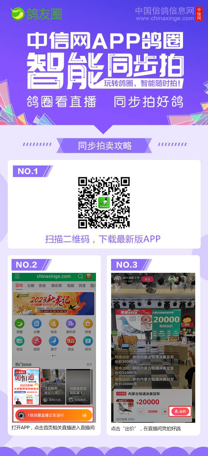 1、本场为网络现场结合拍卖,商品的具体结标时间,以现场拍卖师宣布落槌时间为准,请注意观看现场直播视频,网上预出价已开放,欢迎各地鸽友参与竞拍。