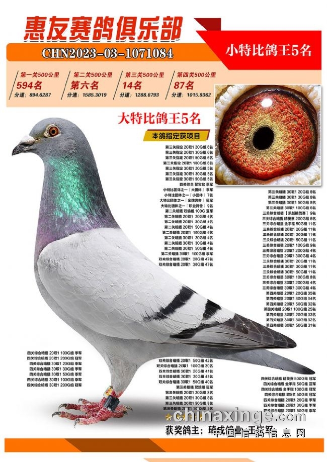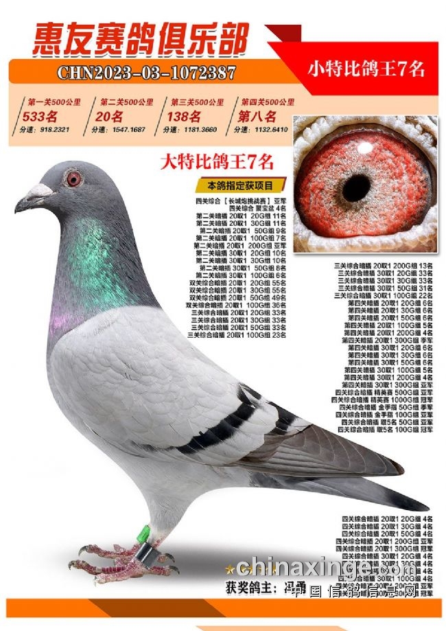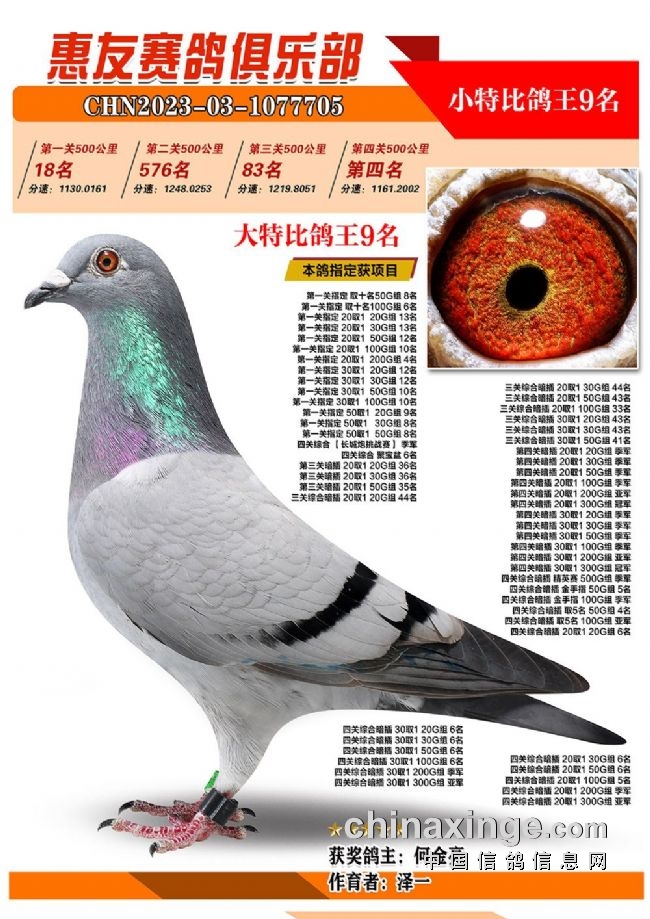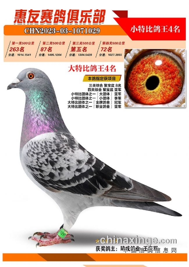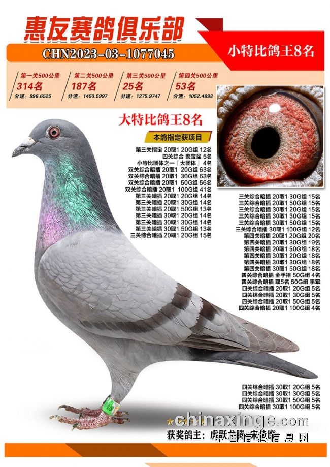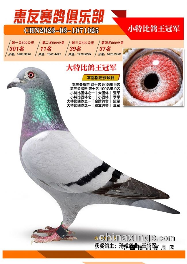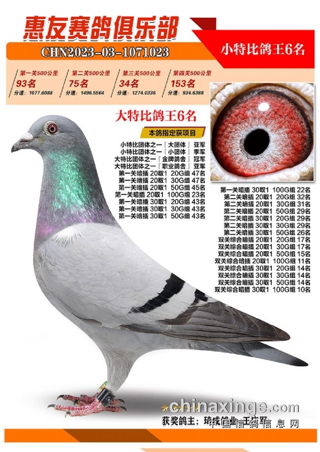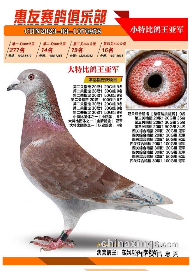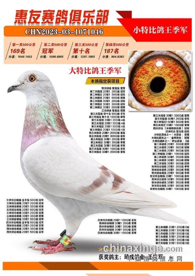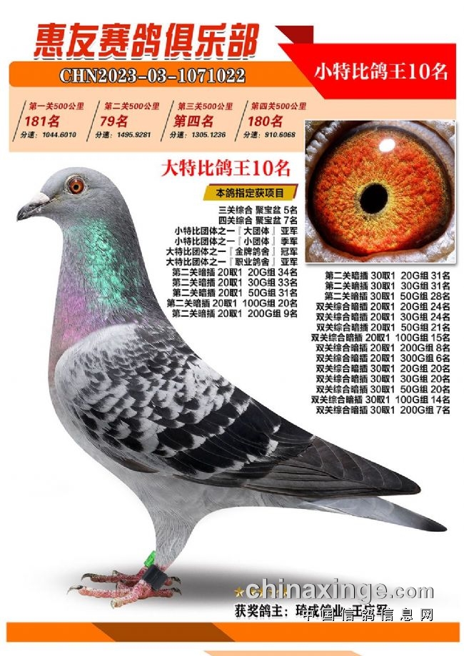 战四关,争鸽王。历经四关角逐,“包揽专业户”琦成鸽业+王庆军的一羽2023-03-1071025灰色砂眼雌鸽,凭借四关301名、11名、39名、37名,稳坐四关鸽王冠军宝座,拿下大特比、小特比鸽王双料冠军。在四关鸽王前十榜单上,琦成鸽业+王庆军独占六羽,分别是1名、3-6名、10名。在181羽入赏鸽中,强势拿下29个获奖席位。值得一提的是,在2022年的惠友四关鸽王赛中,琦成鸽业+王庆军也斩获了大特比鸽王冠军、小特比鸽王亚军,实力超群。东风019-李俊华的一羽2023-03-1070958红绛鸽,则斩获四关鸽王亚军,四关战绩277名、14名、79名、16名。