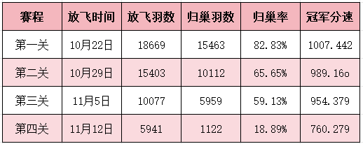 我们一起回顾前四关正赛简况:从以下数据可以看出,前三关归巢率过半,但是第四关惨遭滑铁卢,放飞近六千羽赛鸽,归巢仅千余羽。而接下来还有一关,一千多羽赛鸽将肩负重任,完成今年冬赛的最后一关挑战。