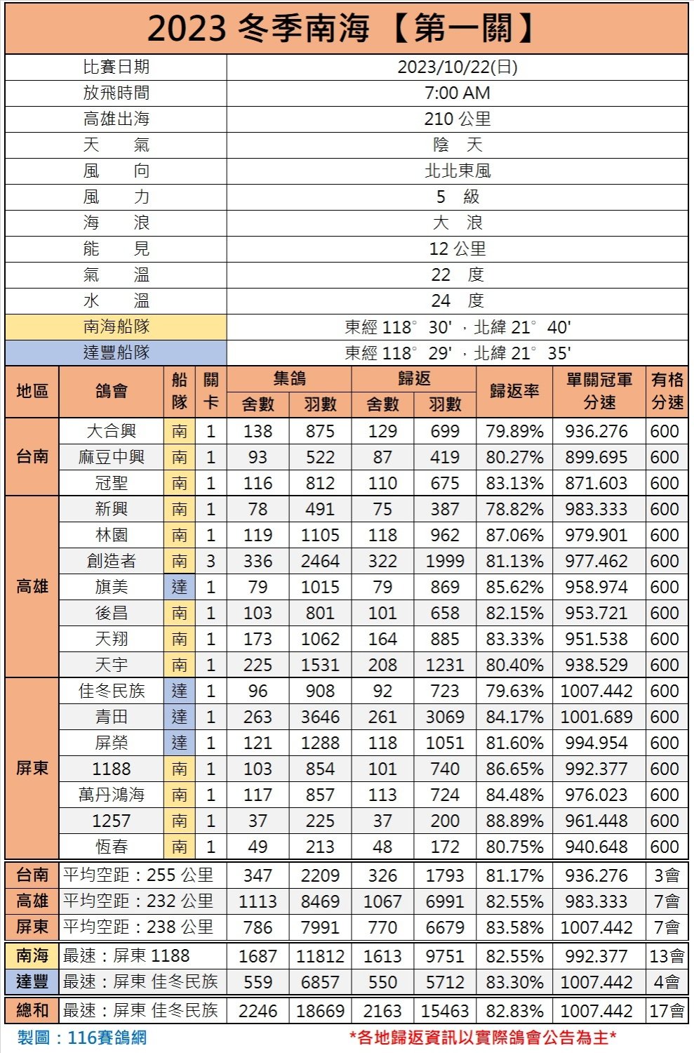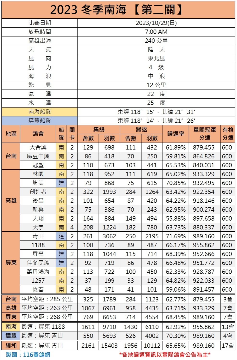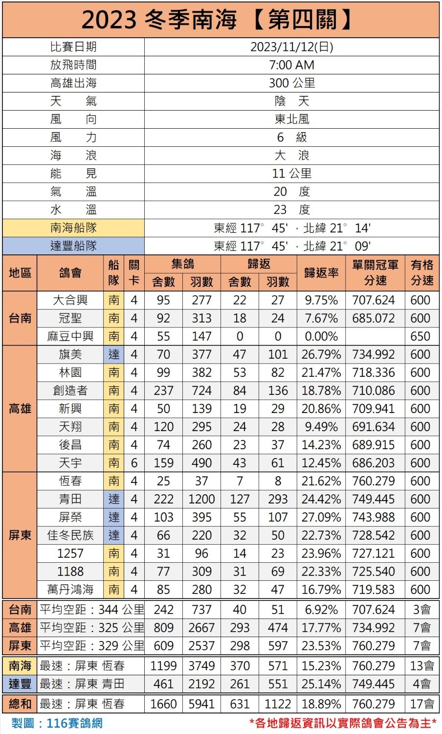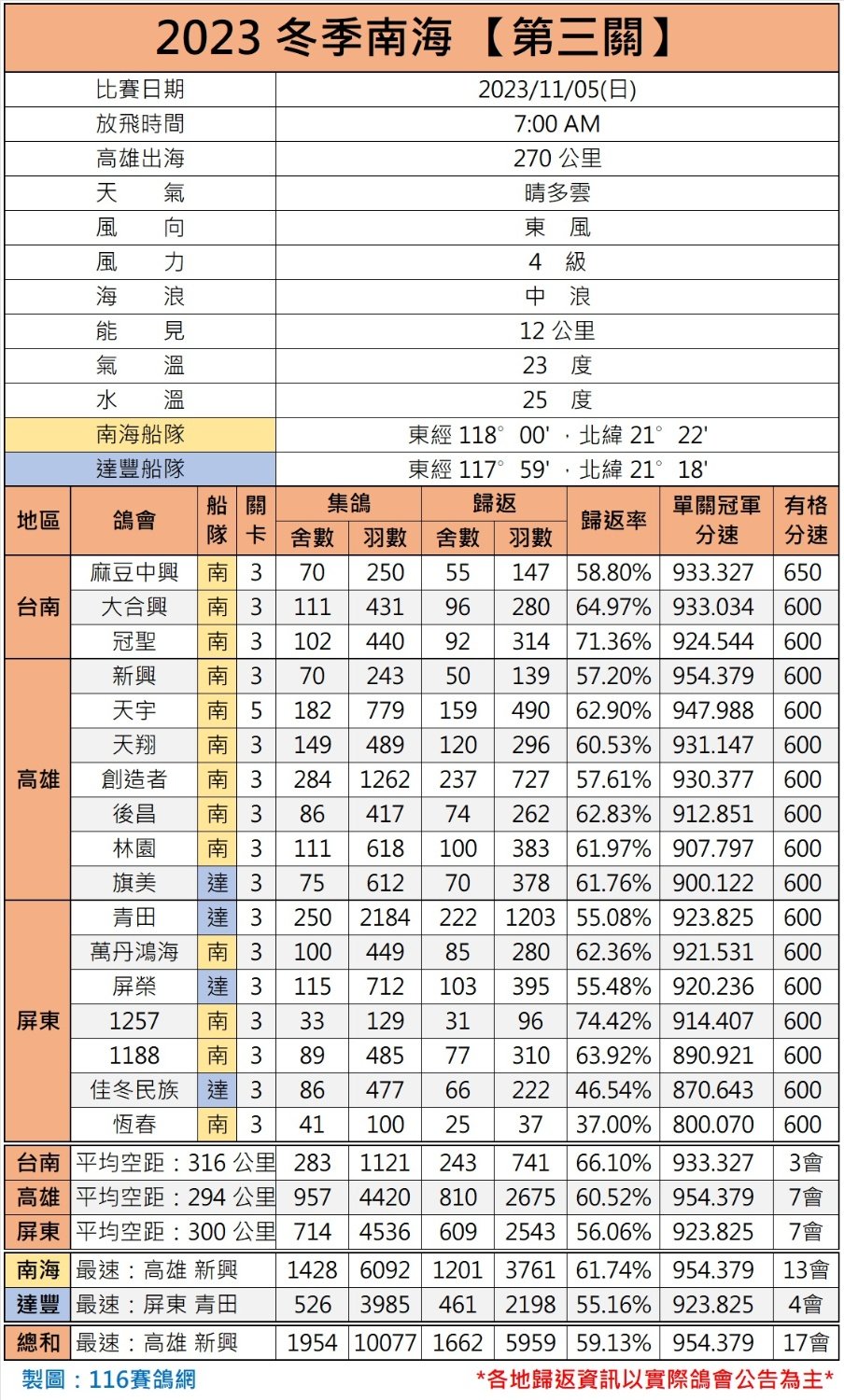 海翔一直被大家认为是极为残酷的比赛,十分考验赛鸽的定向和体能,能在这样艰巨的比赛脱颖而出的鸽子,也势必受到众多鸽友的青睐。自10月以来,2023年台湾南海冬季赛打得火热,比完两场资格赛还有超1.8万羽赛鸽顺利返回。而经过四关正赛的淬炼,仅有1122羽赛鸽完成挑战。第五关比赛即将打响,谁将跨越重重艰难险阻,载誉而归?我们拭目以待!