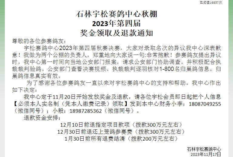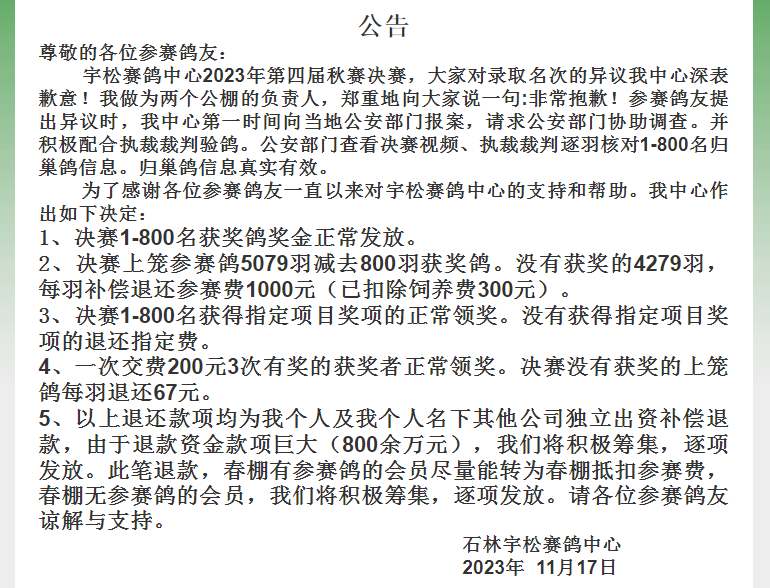 第一则公告表示,大家对于2023年秋赛决赛录取名次的异议,作为两个公棚的负责人表示非常抱歉!参赛鸽友提出异议时,中心第一时间向当地公安部门报案,请求协助调查。公安部门经查看决赛视频、执裁裁判逐羽核对1-800名归巢鸽信息,确认归巢鸽信息真实有效。