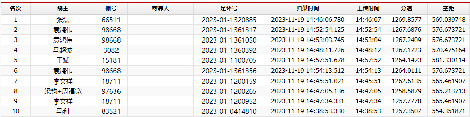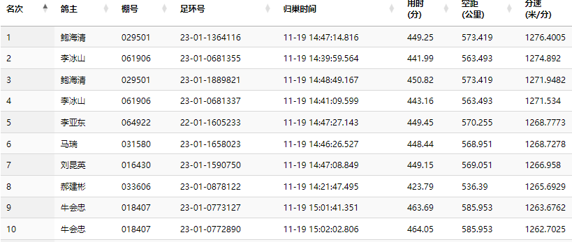 鲍海清的23-01-1364116赛鸽于14点47分14秒归巢,飞行空距573.419公里,分速为1276.4005米/分,拿下丰台区冠军,这也是全场最高分速。其麾下另一羽赛鸽23-01-1889821飞行空距573.419公里,分速1271.9482米/分,获得季军。