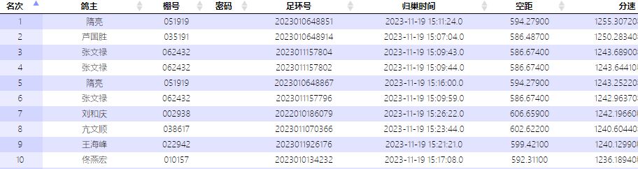 接近一个小时后朝阳区见鸽归来,隋亮的2023010648851赛鸽于15点11分24秒报进,飞行空距594.27900公里,分速为1255.3072米/分,获得冠军,这位鸽主也是上一关550公里朝阳区冠军。其另一羽赛鸽2023010648867获得第5名。芦国胜的2023010648914以1250.2834米/分的成绩拿下亚军。张文禄名下三羽赛鸽2023011157804、2023011157802、2023011157796分明获得3名、4名、6名,最高分速1243.6890米/分。