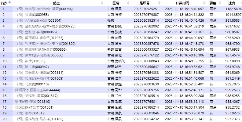 根据直播平台显示,当天下午15点13分,一羽雨点鸽率先报到,环号为2023270925251,鸽主是李林得+崇宁鸽舍-闻双,飞行分速1182.5494米/分,荣获冠军。此外,这羽鸽子领先了第二名赛鸽71分钟。