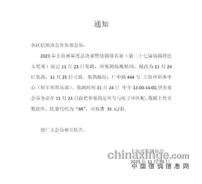 1、严格执行《上海市信鸽竞赛规则》和《2023年上海市信鸽竞赛须知》。