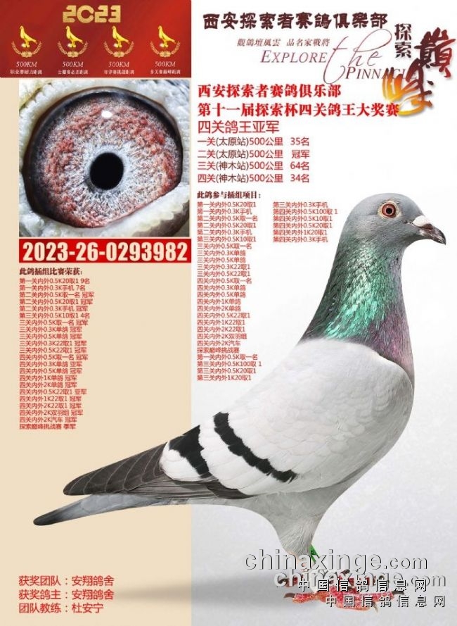 随着2023年秋赛落下帷幕,杜安宁再次夺得西安探索者俱乐部最佳教练冠军、西安慧能俱乐部最佳教练季军、单关冠军和鸽王大奖的优异成绩,用实力实现他的愿景,摘金夺银展现他的使命。