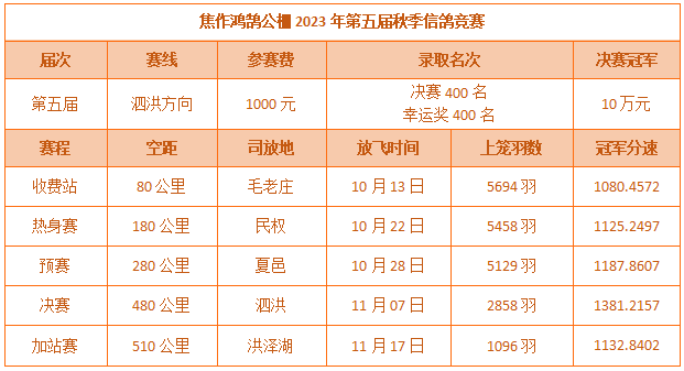 今年设有三关大奖赛,参赛费1000元,决赛奖励400名。同时,交缴纳保证金的会员,可获得400个幸运奖资格,并免费赢取12辆价值2.91W宏光电动车。在鸽友的支持下,总计收鸽6867羽。80公里收费站上笼5694羽,存棚率超八成,展现了良好的养功。